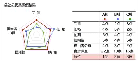 各社からの提案が出揃ったら、予め設計した評価項目と評価基準に則って評価します。各社の品質・価格・納期・信頼性を数値化し、評価レポートとしてまとめます。