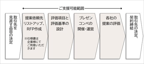 提案依頼から提案評価までの一連の流れをご支援します。提案依頼書やRFP、評価項目、提案評価レポートなどの成果物を、企業様とすり合わせながら作成いたします。